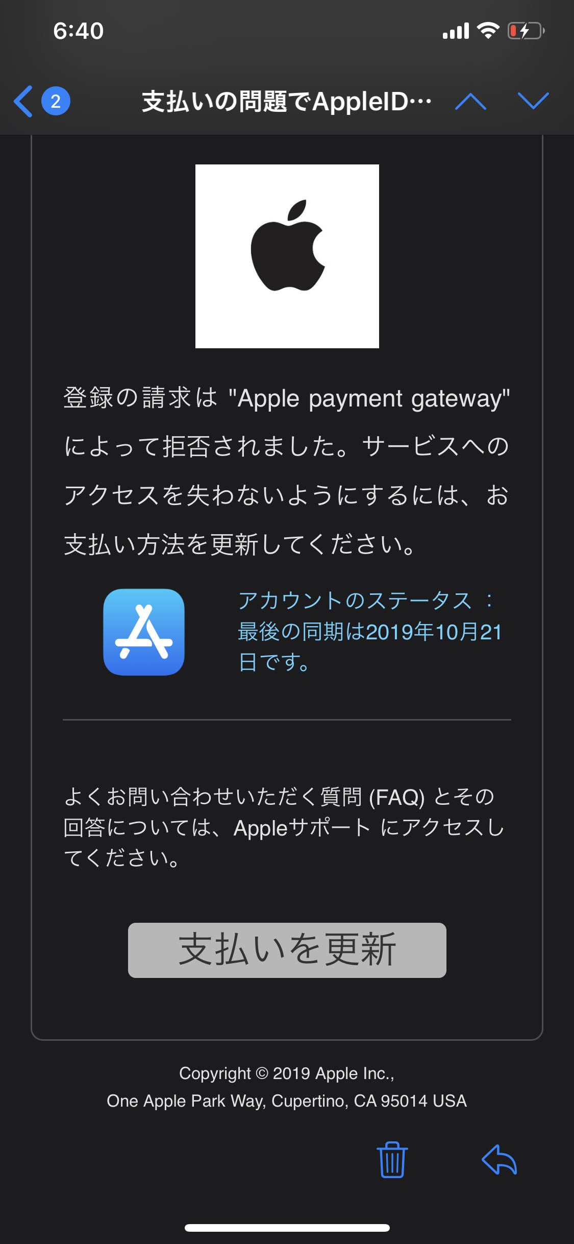 10例えば、Apple IDを使った支払があるのに、クレジットカードの期限切れなどで支払が完了していないような時もあります。