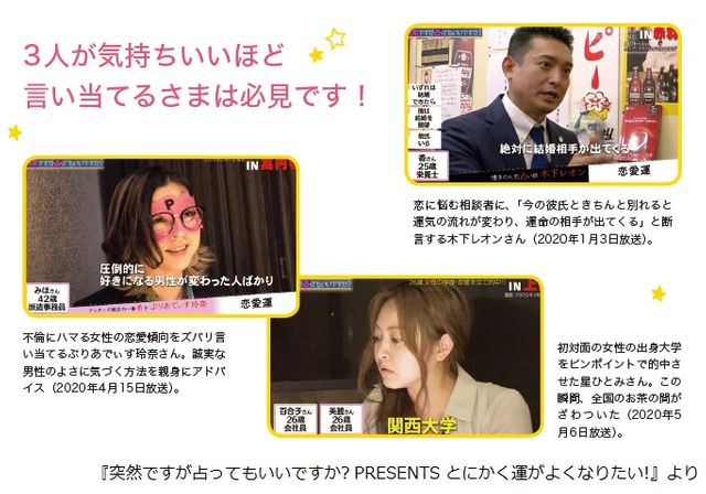 折坂悠太/角部屋 関連記事 : 7月22日の放送回プレイリスト• 木下レオン先生に占ってもらう方法はこちらの3つ• 大橋トリオ/突然の贈り物• FlowerFlower/愛のうた• 突然ですが占ってもいいですか?4月29日放送の挿入歌 こちらは4月29日放送の曲一覧です。 占い師3人についてまとめた記事はこちら!!! 突然ですが占ってもいいですかのCMのBGMの曲は? CMで流れていたキャッチーでかわいい声の曲はなんでしょうか? 調べてみるとこちらと判明しました。