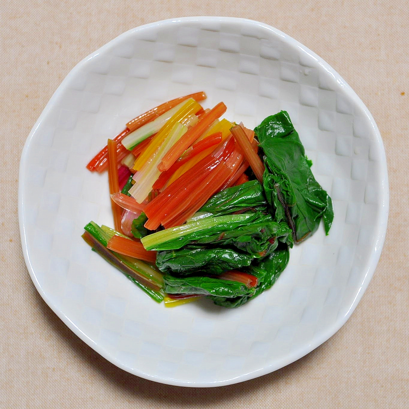 1スイスチャードや野菜を食べやすい大きさに切る(タマネギは塩もみをしておく)• 「ちょっとカラフルなほうれん草のおひたし」のようなイメージです。
